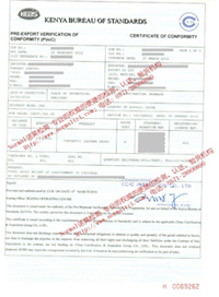 肯尼亞標(biāo)準(zhǔn)局(KEBS)于2005年9月29日開始實(shí)施出口前標(biāo)準(zhǔn)符合性驗(yàn)證計(jì)劃(PVoC)。PVoC目錄內(nèi)的產(chǎn)品必須在出貨前獲得符合性證書(CoC),到港時(shí)提供給肯尼亞海關(guān),否則將無(wú)法入境。如果沒(méi)有CoC 特殊情況下可由KEBS決定對(duì)該批貨物實(shí)施檢驗(yàn),并處以罰款。