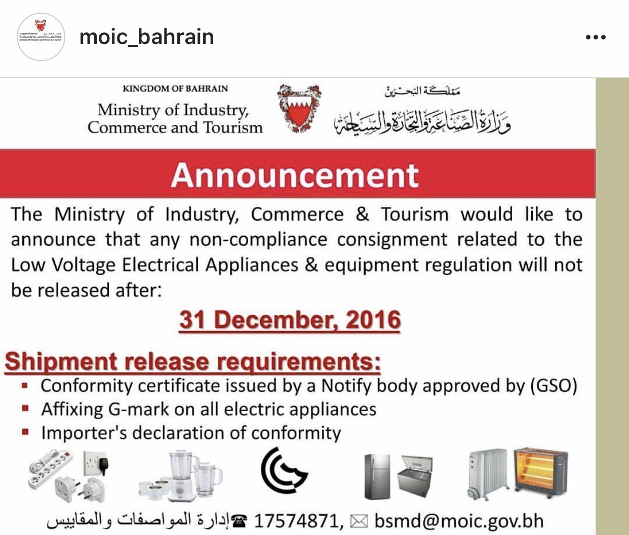 據巴林政府工商及旅游部的通知,從20161231日以后,所有不符合海灣地區(qū)低壓電氣設備技術條例的貨物將不被放行。貨品放行需滿足以下要求: