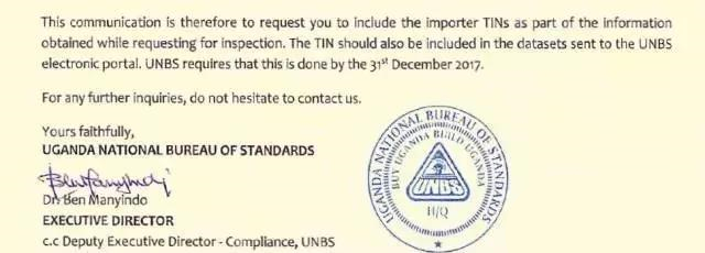 烏干達(dá)UNBS要求增加TIN號(hào)碼和啟用CoC電子證書
