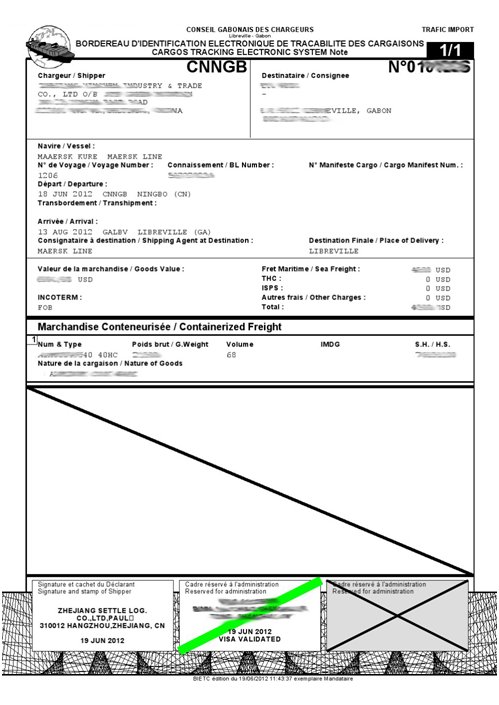 針對上述規(guī)定我們建議貴司(發(fā)貨人或出口商)嚴(yán)格地遵守以上加蓬共和國的法令并在指定時間內(nèi)提出跟蹤單的申請。 以上的條例及收費率會根據(jù)加蓬有關(guān)當(dāng)局的條例隨時更改。