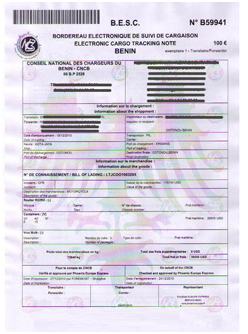 根據(jù)貝寧國法令,凡發(fā)貨至貝寧科托努 (COTONOU) 港或經(jīng)由此港轉(zhuǎn)往其他目的地的貨物都必須申請電子貨物跟蹤單BESCBESC全稱為:BORDEREAU DE SUIVI DE CARGAISON