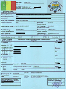 根據(jù)馬里(MALI)港務(wù)局要求:針對發(fā)往馬里的貨物,必須辦理馬里CTN NO.(貨物跟蹤號碼),否則在起運港船公司無法正常出具海運提單,目的港將無法清關(guān)和提貨。馬里CTN NO.和尼日利亞CTN NO.類似,CTN NO.是英文Cargo Tracking Note Number的首字母縮寫,意思是貨物跟蹤號碼,又稱為貨物進口清單。